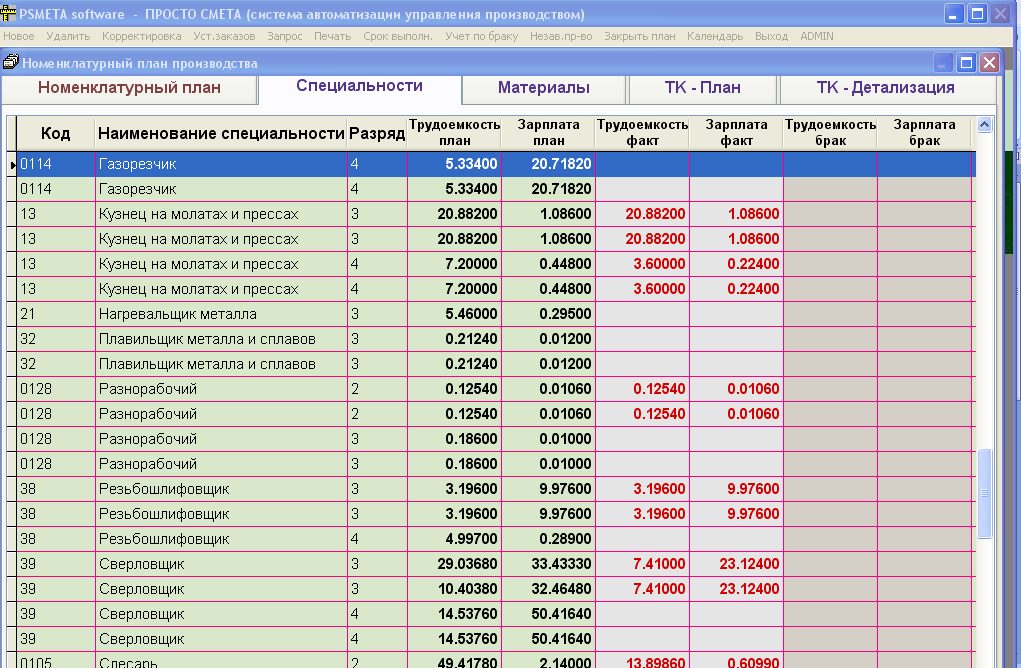 Труд – формирование данных по используемых специальностях данные по трудоемкости и зарплате;